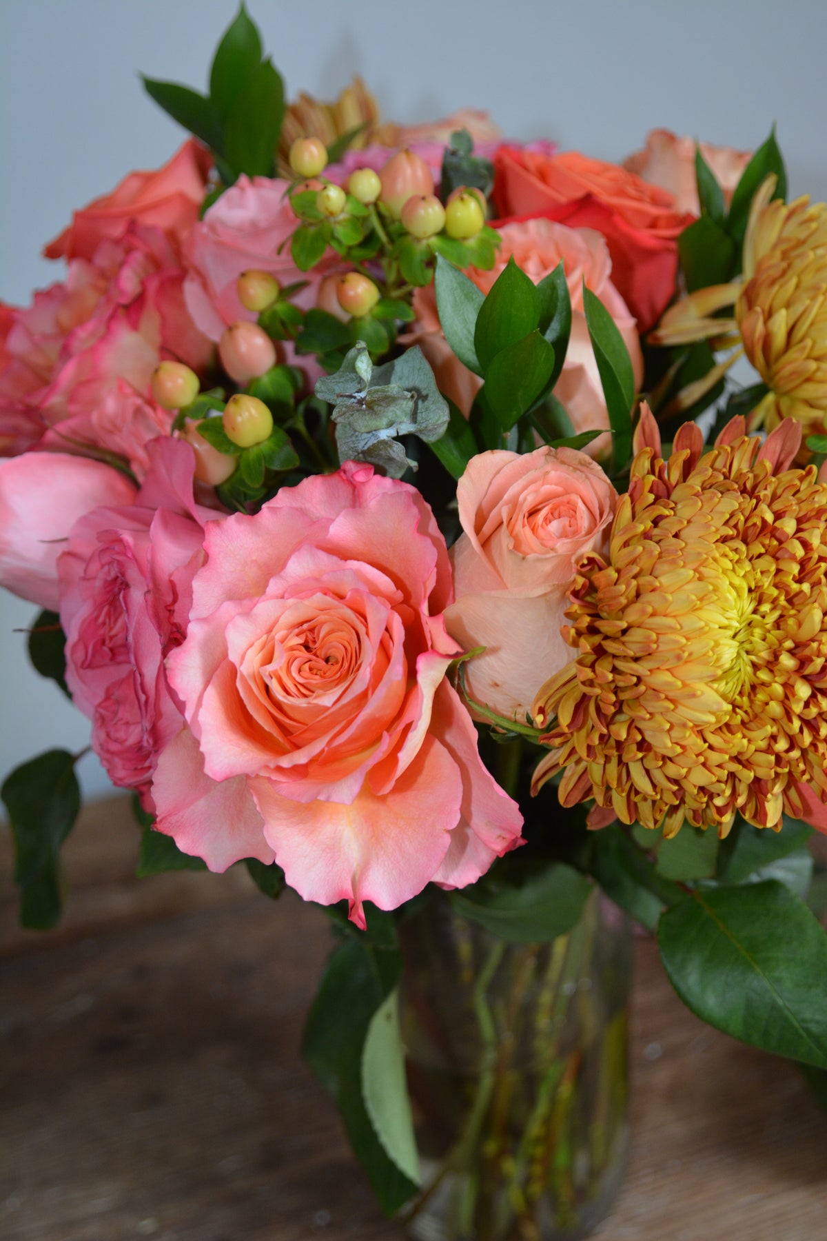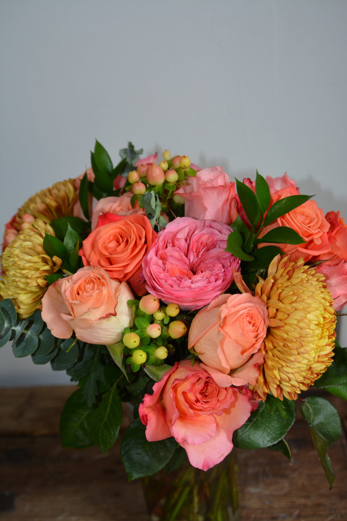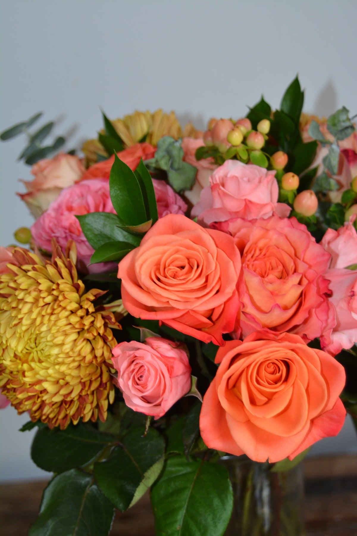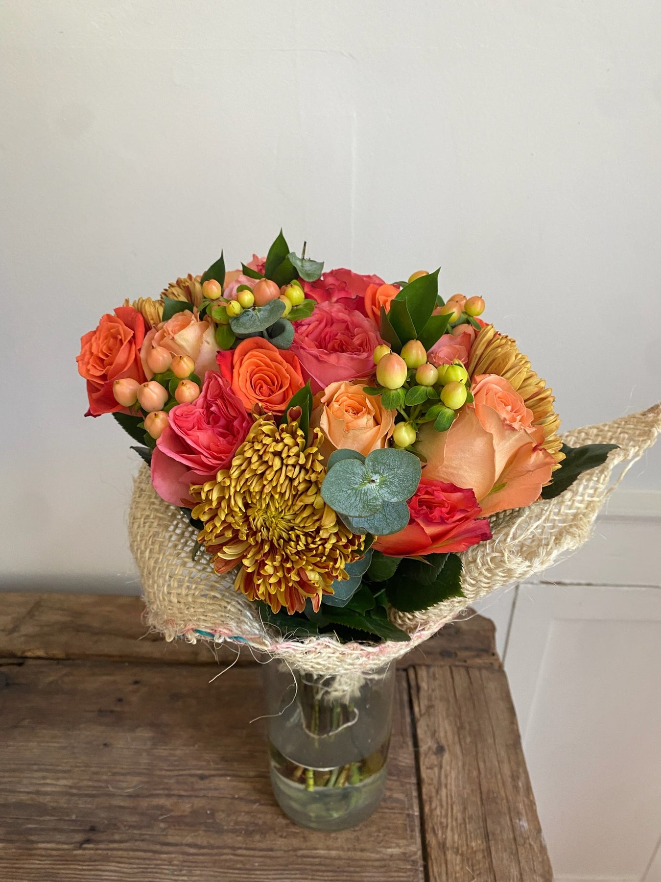 Be grateful for our vibrant pink, purple, and orange arrangement, complemented by refreshing eucalyptus. It is a perfect gift to express appreciation and admiration.