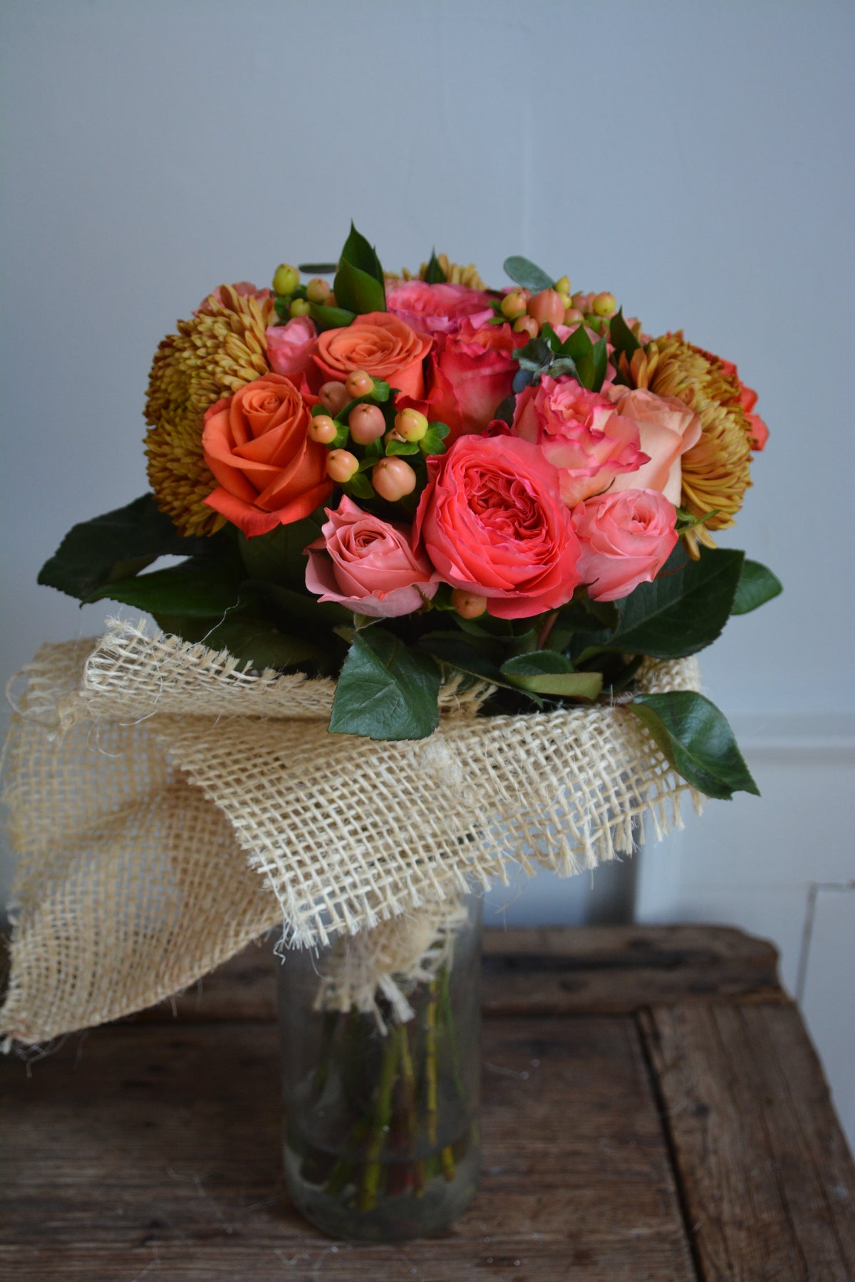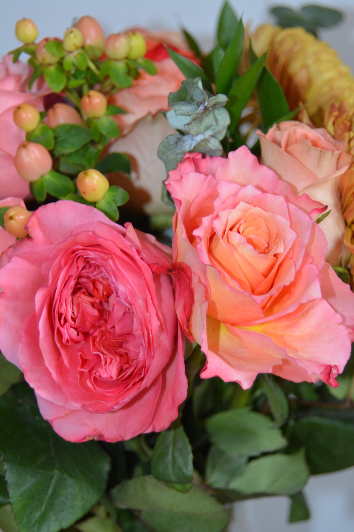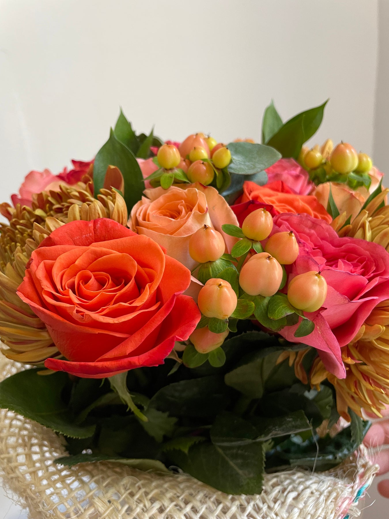 Be grateful for our vibrant pink, purple, and orange arrangement, complemented by refreshing eucalyptus. It is a perfect gift to express appreciation and admiration.