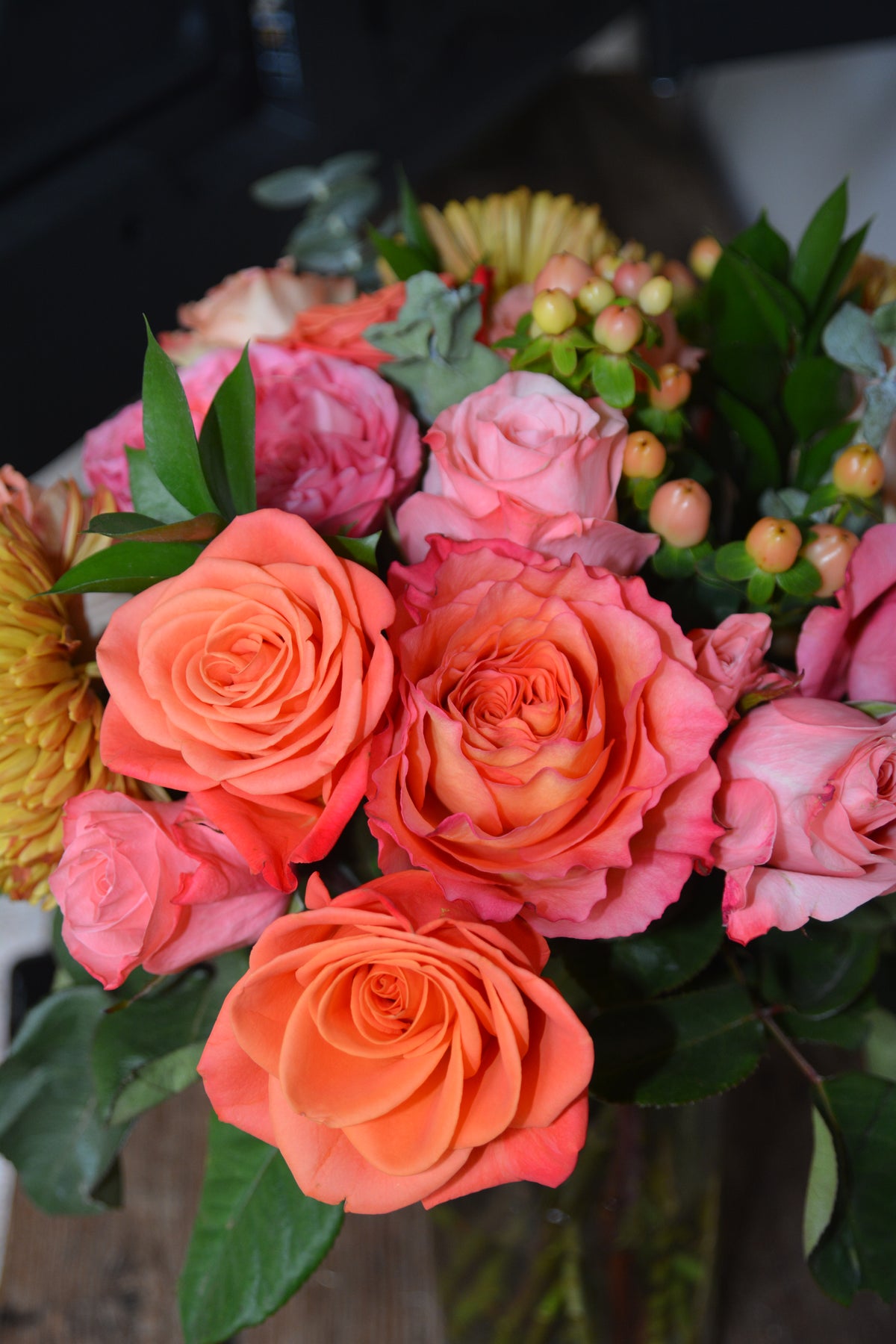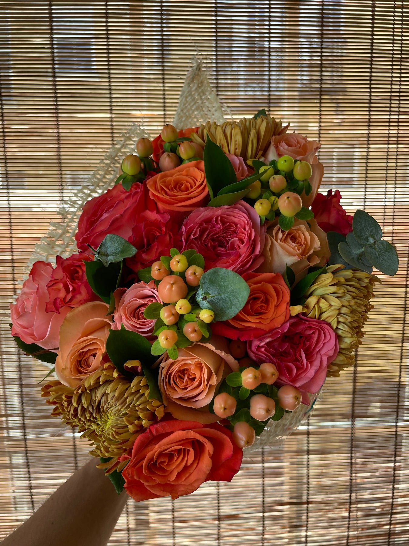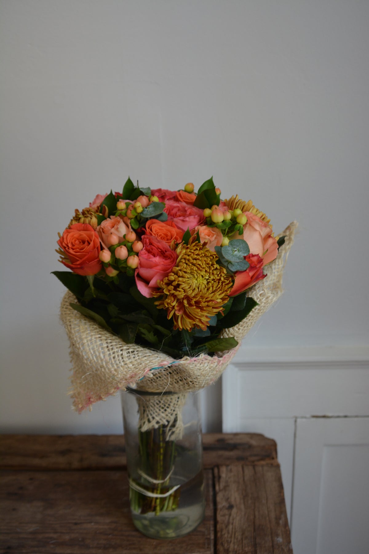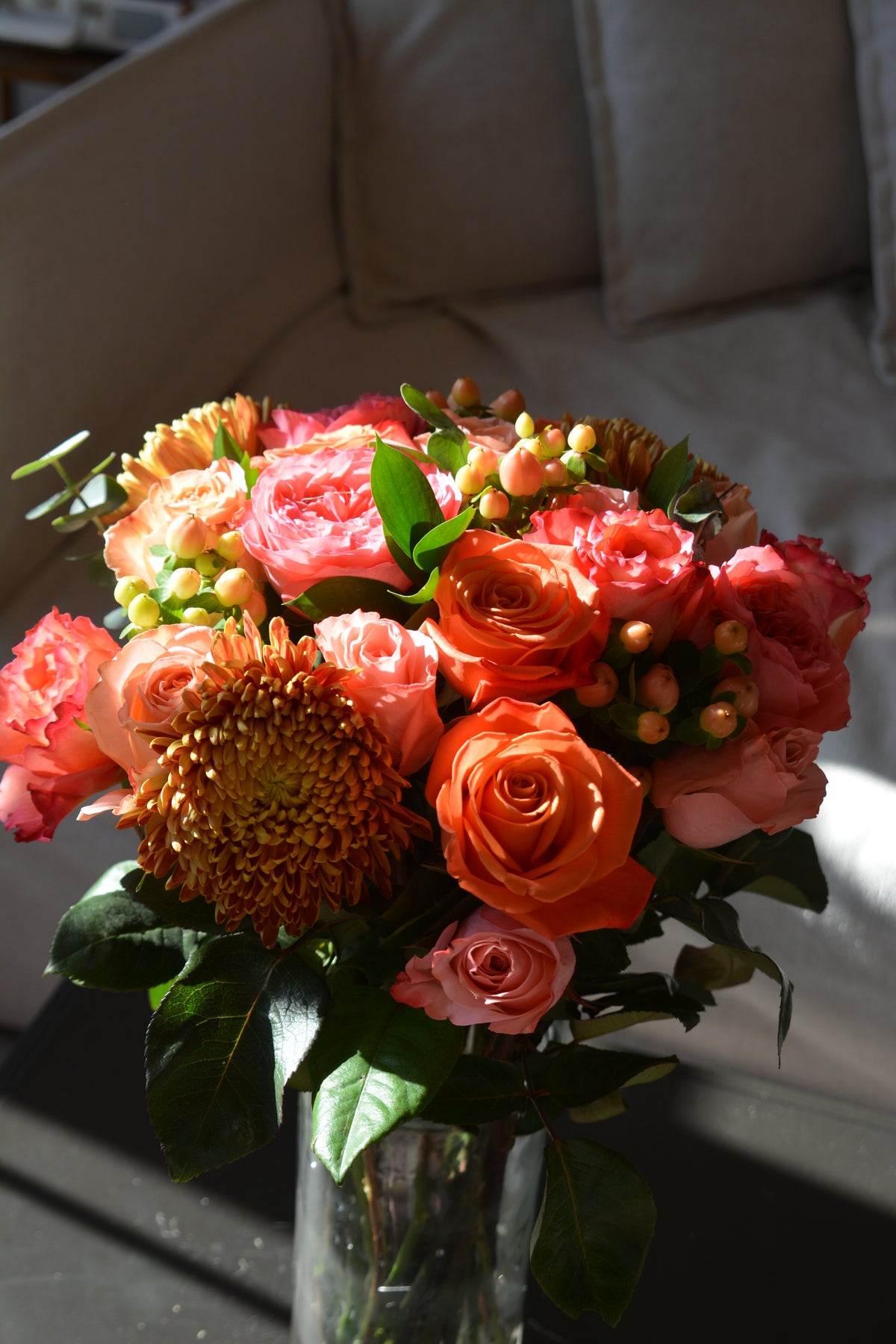 Be grateful for our vibrant pink, purple, and orange arrangement, complemented by refreshing eucalyptus. It is a perfect gift to express appreciation and admiration.