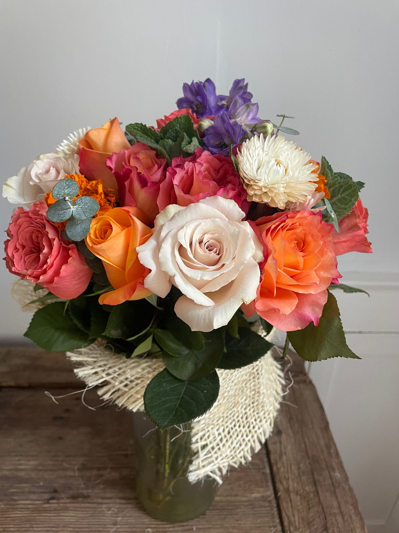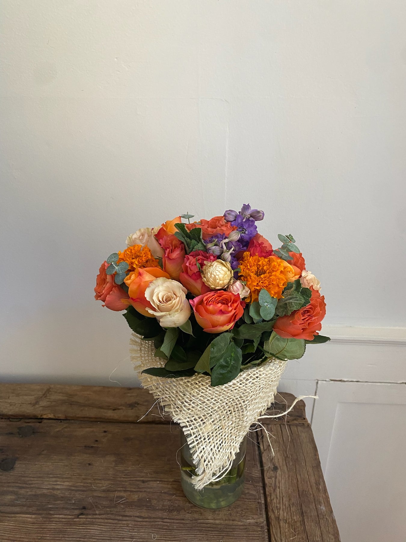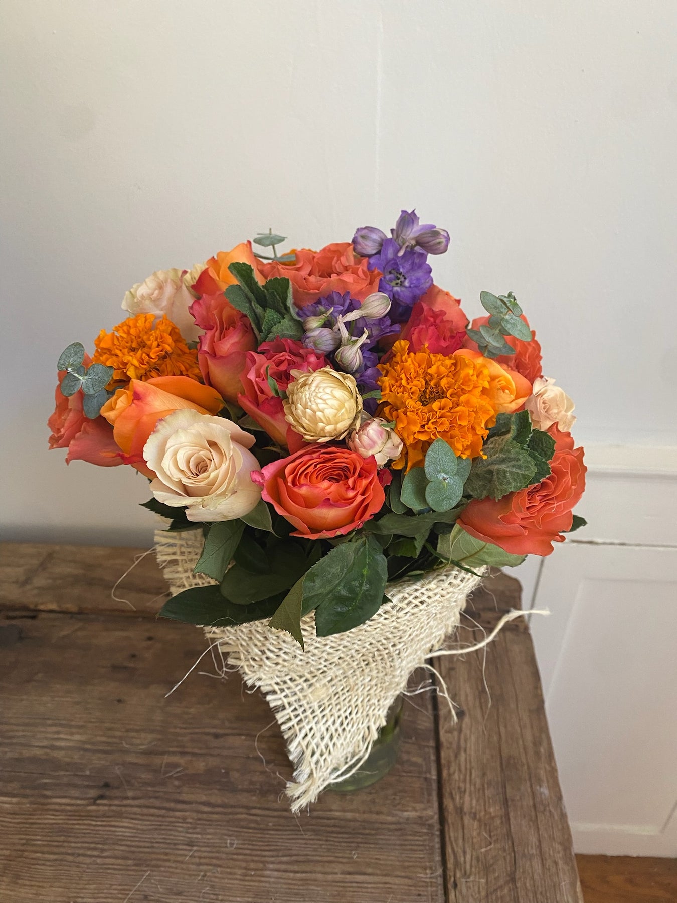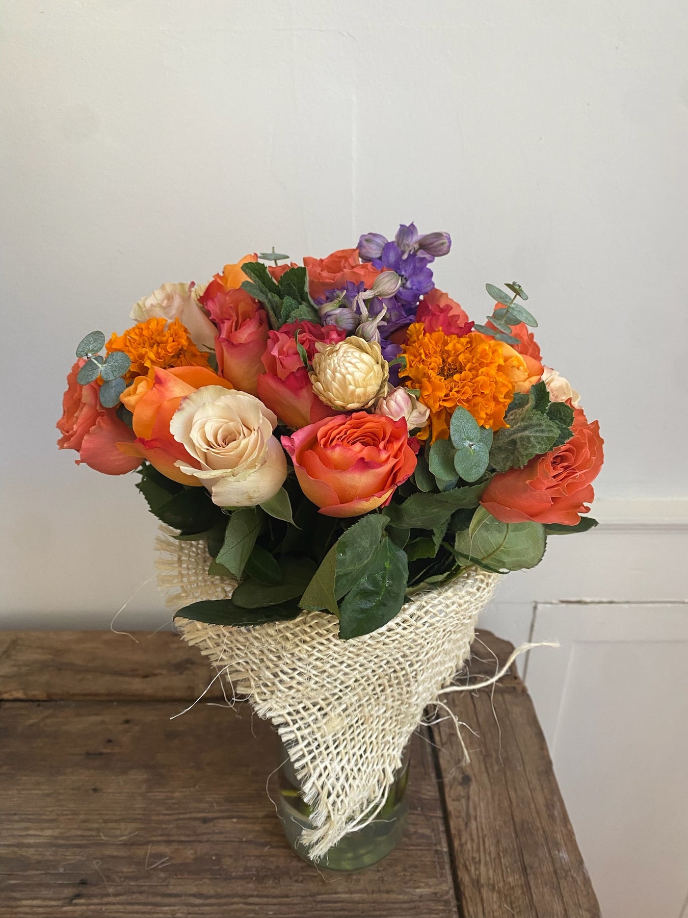 Welcome warmth and hospitality with our vibrant orange, beige, peach, and purple blooms, accented with eucalyptus and mint for a refreshing, inviting atmosphere.