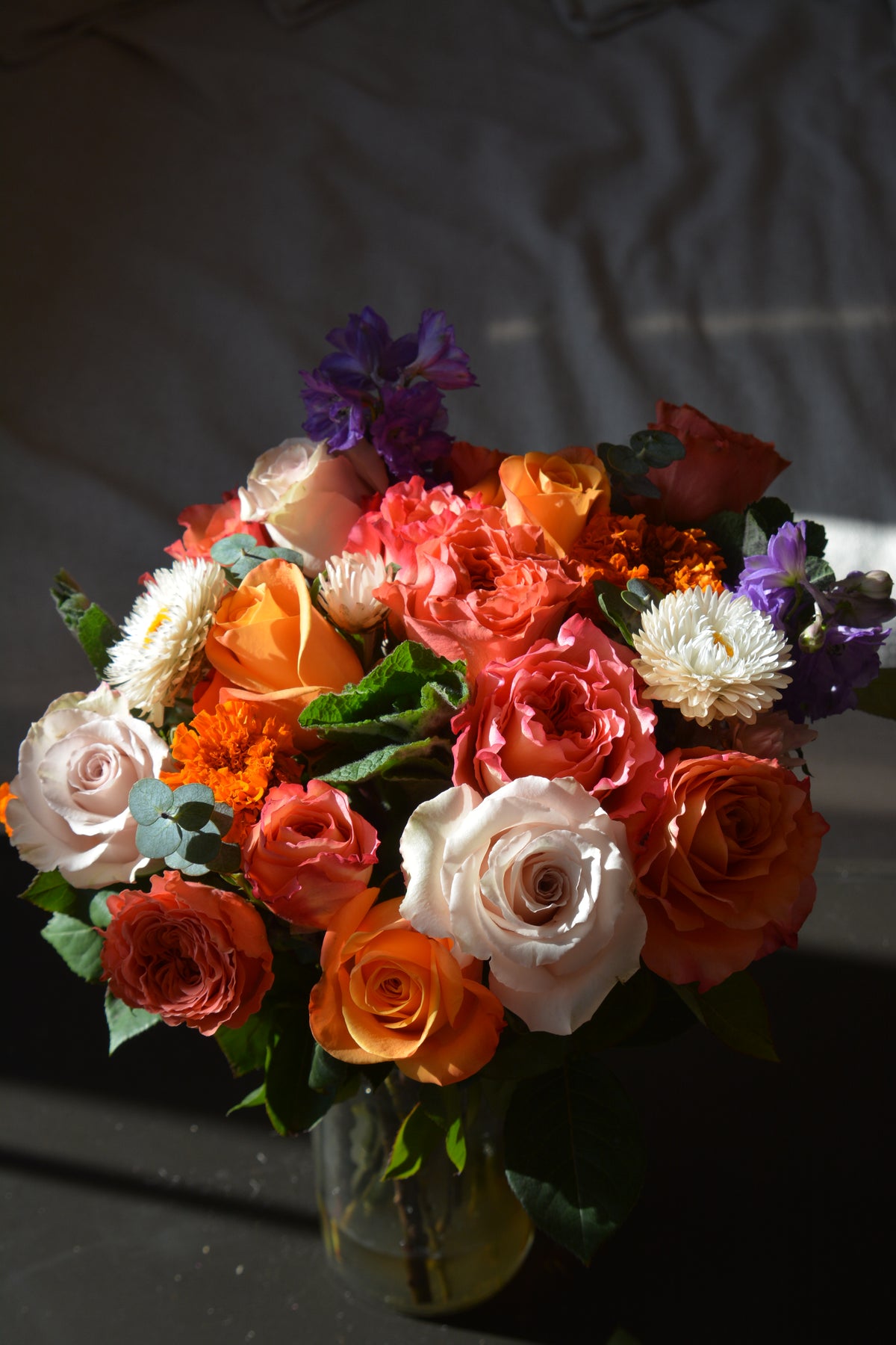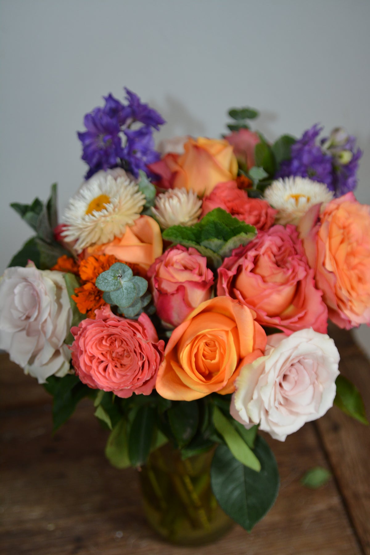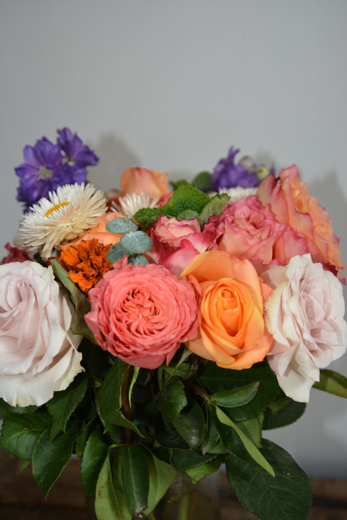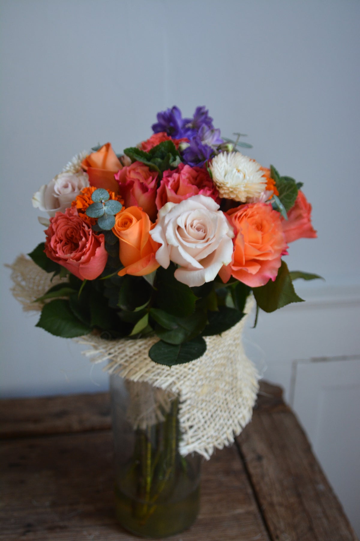Welcome warmth and hospitality with our vibrant orange, beige, peach, and purple blooms, accented with eucalyptus and mint for a refreshing, inviting atmosphere.