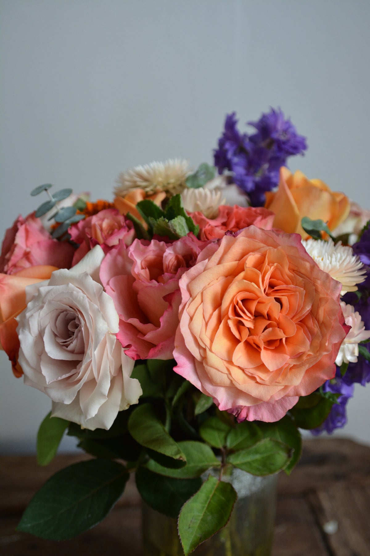 Welcome to our stunning flower arrangement, perfect for bringing a sense of warmth and hospitality to any space. The beautiful blooms of orange, beige, peach, and purple create an inviting atmosphere for any occasion.